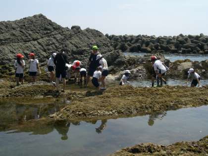 岩場の潮だまりはところどころ腰辺りまであります。子供たちはお構いなしに入っていきました。ヤドカリを見つけては歓声をあげたり、捕まえて写真をとってもらったりしました。生き物をこれほど真剣に観察したのは初めてだったようです。楽しい時間はあっと言う間に過ぎ、1時間あまりの観察時間が終わりました。