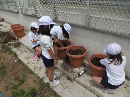 生活科の授業で観察したさつまいもの苗をそれぞれの鉢に植えました。子どもたちは自分たちが育てているトマトとくらべて観察したり,土を自分で掘って一つ一つ丁寧に植えたりしました。どれだけ大きなさつまいもが収穫できるか今からが楽しみです。