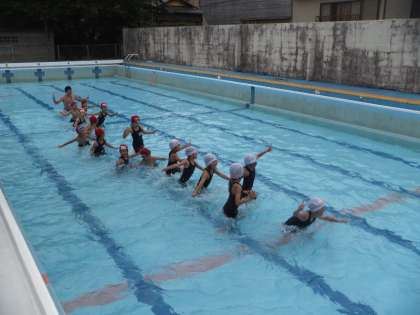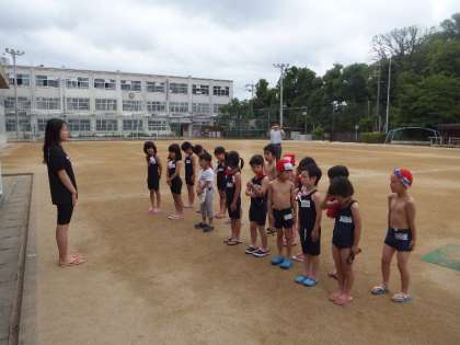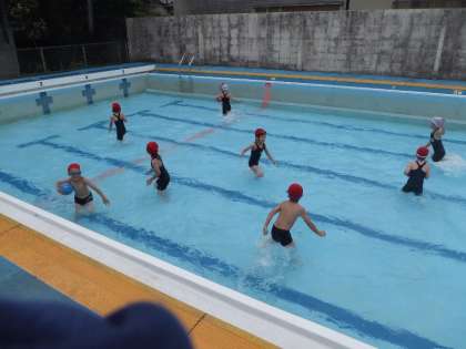 1年生は初めてのプール学習なので,プールのきまりを2年生の動きを見ながら学習しました。プールの中に入ってからは,歩いたり,走ったり,かにさん歩きやおにごっこなどをして楽しく学習しました。