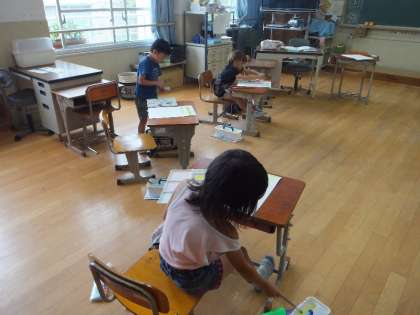 2年生になってから使っている絵の具で色遊びをしました。赤,青,黄,白の4色を使って,少しずつ混ぜ,出来上がった色を使って線を引きました。子どもたちは色を混ぜる中で,「どんな色になるのかな。」「こんな色ができたよ。」などの声を上げながら,いろいろな色を作っていました。