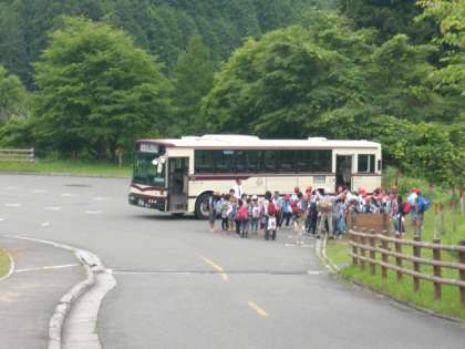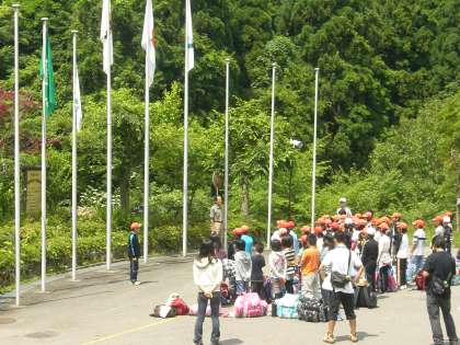 バスに揺られること1時間。山の家に到着しました。周りは山に囲まれ、空気が澄んでいて、とても素敵なところです。これからの活動が楽しみです。入所式を済ませて、荷物を今日泊まる、ロッジ1に入れました。