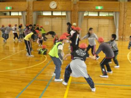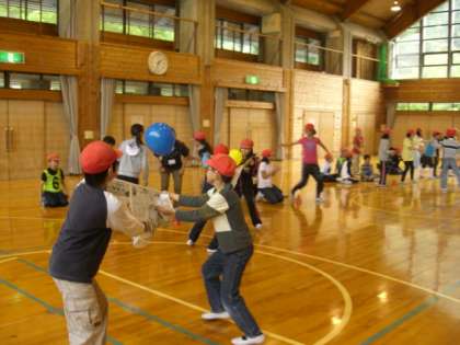 風船運びリレーや爆弾ゲームなど、風船を使ったゲームのあと、「王様おいかけゲーム」をしました。輪になっている中にゼッケンをつけているのが王様です。輪の外の鬼に王様がタッチされると負けになります。王様がタッチされないように、手をつないでいる人たちは、手を離さないように協力しあって、右に回ったり、左に回ったりして逃げるのです。15秒の制限時間内に、鬼が捕まえるのは、なかなか難しかったです。