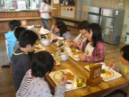 花背山の家の食堂での初めての食事です。牛乳とオレンジジュースから一種類、味噌汁かスープから一種類選ぶことができます。ご飯もパンも食べ放題。おかずもおかわりし放題です。子どもたちは、天狗杉の登山に向けて、いつも以上にモリモリ食べていました。