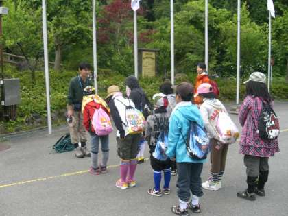 今日、一緒に登山していただく山の家の山本先生からお話を伺ったあと、準備体操をしました。円陣を組み、気合いを入れて、いざ、出発です。