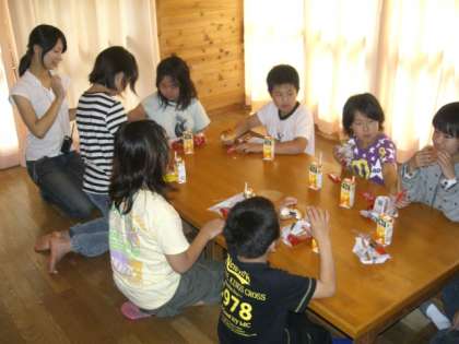 予定よりも40分も早く、本館前に到着しました。お世話になった花背山の家の先生にお礼を言いました。そのあとは、ロッジ1のミーティングルームで、オレンジジュースで、全員無事登頂の祝杯をあげました。みんなチョコレートロールもぺろりと食べました。