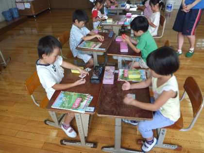 夏休み明けの授業から「20までの数」の新しい学習を進めています。今日は20までの数を数図ブロックで並べたり,二人組になって,11から20までの数字カードを使ったゲームをしたりしました。カードの学習では,お互いの出した1枚のカードを見て,どちらの数字が大きいか確認しながらゲームを進めていました。