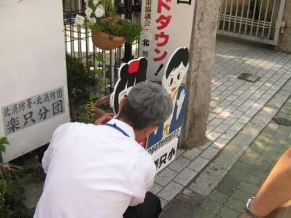 夏休み中に管理用務員の増田さんが作成された「ストップ坊や」が校門の前に設置されました。来校される方の乗用車や校門前を通る自転車等に,スピードを控えて子どもの安全に注意を呼び掛ける役割をしてもらいます。