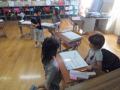 算数の授業でホワイトボードや数図ブロックを使って学習を進めました。