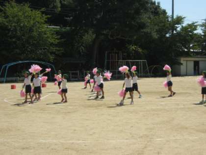 運動会まであと2日。どの学年も団体演技の最終練習を運動場でしました。本番用の小道具や衣装をつけて気持ちの入った踊りをしていました。