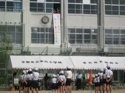 9月21日(土)に運動会が行われました。秋晴れの空のもと,楽只っ子たちは練習の成果を発揮して一所懸命がんばりました。開会式では一人一人堂々と入場行進を行い,それぞれの係の児童もしっかり役割を果たしました。