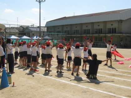 午後の部は応援合戦からスタートしました。どちらの組も応援団の児童が引っ張って大きな声を出していました。