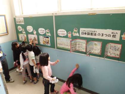 朝会後は,憲法月間の掲示を見て教室にもどる姿も見られました。