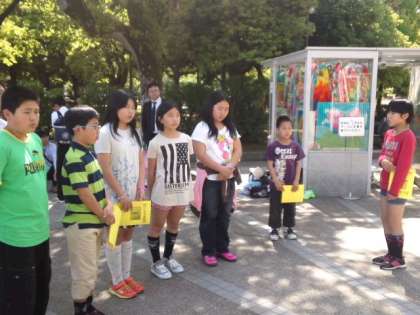 原爆の子の像の前でセレモニーを行いました。全員が戦争や原爆について学習した中で今感じていることを、発表しました。その後、作ってきた記念のパネルを捧げ、みんなで翼をくださいを歌ってセレモニーを終えました。