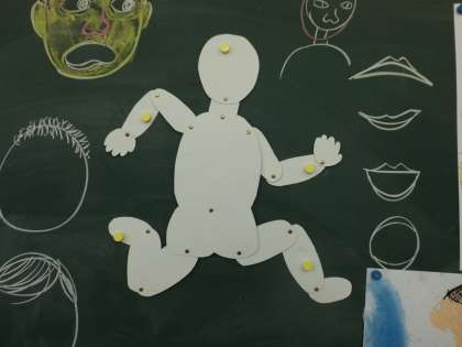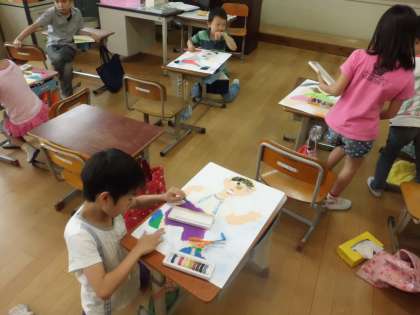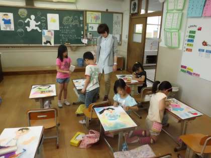 2年生は図画工作の時間に人物の描き方について習いました。関節の動きなどについても触れ,コンテを使って一人ひとりこだわって描いていました。