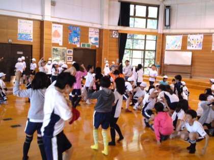 同じ中学校へ行く三校の合同プログラムです。それぞれの学校が、進化じゃんけん、人間知恵の輪、じゃんけん列車を担当してみんなで楽しみました。