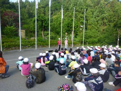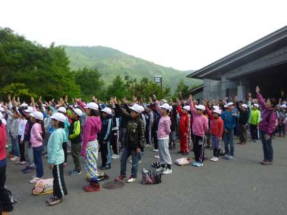 今日、山の家に宿泊している5校(下鳥羽、向島南、仁和、紫野、楽只)の小学校合同の朝のつどいが行われました。各校の代表が学校紹介をしてくれました。楽只小学校の代表も立派に学校紹介をしてくれました。5校とも5分前行動で早く集まれたので、ご褒美にゲームをしました。何秒間「アー」を声を出し続けられるかというチャレンジランキングのゲームです。息が切れそうになったら、あげている手を下すというルールでした。優勝者は49秒でした。みんなでストレッチ体操もしましたが、とても元気そうです。