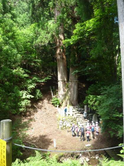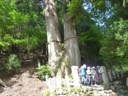 くだり切って川沿いをしばらく歩くと、三本杉に到着しました。圧倒的な迫力を感じました。樹齢は千二百年といわれています。ここに来るまで大変苦しい時もありましたが、その苦労が一気に吹き飛びました。
