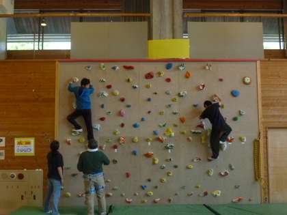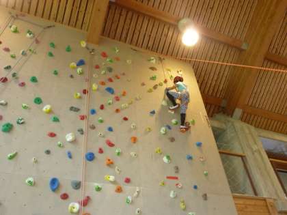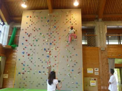 午前中の活動はクライミングです。プレイホールの壁につけられたホールドと呼ばれる石のような形をしたものに、手や足をかけて登る競技です。初めは、ボルダリングと呼ばれる高さ3mの壁で練習しました。7メートル壁では、命綱をつけて挑戦しました。1回目は、うまく登れなかった子も、2回目はスムーズに上り下りができていました。ちょっとドキドキしましたが、「もう一度やりたい」という声があがっていました。