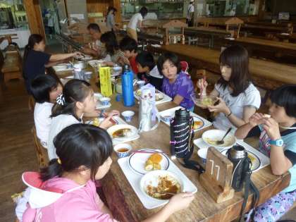 朝と夜の食堂利用はありましたが、昼の食堂は初めてです。今日は、カレーライスか冷麺とライスのセットのいずれかを選択できました。その他に、バイキングのおかずもついています。今日のランチのバイキングは、コロッケとサバの竜田揚げ、煮豆と煮物、サラダにバナナがありました。豪華のランチに満足そうでした。昼食後は、今晩のキャンプファイアーの出し物の担当者が司会の練習をしていました。ほかのみんなも一緒に付き合って、盛り上げ役に回っていました。紫野小学校のみんなも楽しんでくれるかな? 説明の仕方をお互いにアドバイスしながら練習していました。