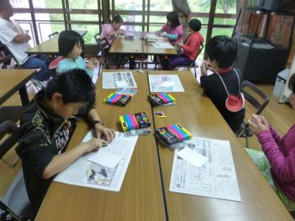 ウッドキーホルダーづくりは、まず、もらった木片の表裏をしっかりと紙やすりで削るところからです。削りながら、どんな絵柄にするか、どんな言葉を入れるのかを考えています。