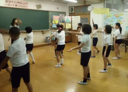 高学年の団体演技は,組体操だけではなく,ダンスも組み合わされます。昨日は,はじめてのダンス練習でした。「笑顔が大事!」「指先を見て大きく動いて!」と担任の先生たちからの熱心な指導を受けながら,音楽に合わせて踊りの練習に励んでいます。高学年らしい力強さとさわやかさいっぱいの団体演技,本番が楽しみです。