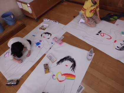 今回は,今現在の自分。つまり,等身大の自分を紙に描く作業に取り組んでいます。友達と2人組になり,線に合わせて鉛筆でなぞっていき,クレパスで目や鼻などの顔のパーツを塗りました。作業中には,「思ったよりも自分って大きいんやなぁ」「自分の髪型と似ているかなぁ」と口にしながら,一生懸命取組んでいました。