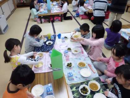 そして保育所の子ども達と対面し,練習してきた言葉も上手に言えました。配膳も自分たちで行い,給食は4つのグループに分かれて食べました。保育所の子どもたちの見本となれるように,美味しく残さず食べました。また,牛乳パックのたたみ方で困っている子には,丁寧に教えてあげる様子も見られました。