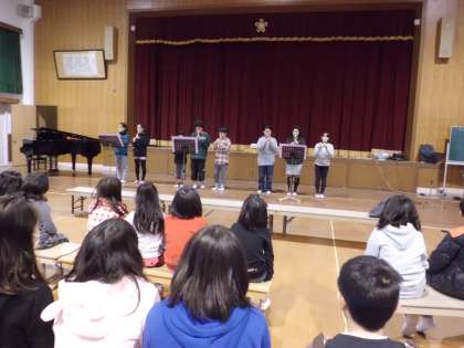 最後に6年生が,リコーダー演奏『パッヘルベル作曲 カノン』を披露してくれました。静かな講堂にきれいな音色が響き渡り,みんな聴き入っていました。今年の6年生8名,様々な場面で6年生として活躍してくれました。中学生になっても頑張ってほしいと願っています。