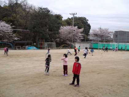 二年生は、担任の先生と一緒に3年生の一部入ってドッジボールに挑戦していました。4年生の女の子たちは、ロンドンからの聴講生も入れて、鬼ごっこをして運動場を走り回っていました。5年生は、男女入り混じってサッカーを楽しんでいました。また,ろ組の男の子は,担任の先生と一緒に去年から続けている朝ランニングをしていました。子ども達は朝から元気です。