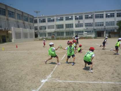 リレーの学習をしています。折り返しの仕方の工夫や走る順番,バトンパスの仕方などを話し合いながら進めています。