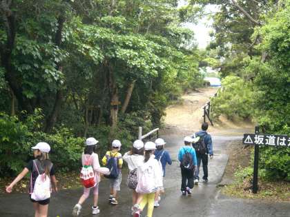バンガローに荷物をおいて、お弁当をもって野外炊事場に移動しました。途中、トイレや明日泊まるテントサイトを確認しながら、野外炊事場に向かいました。急な坂道もあり、注意するポイントを確認しながら進みました。