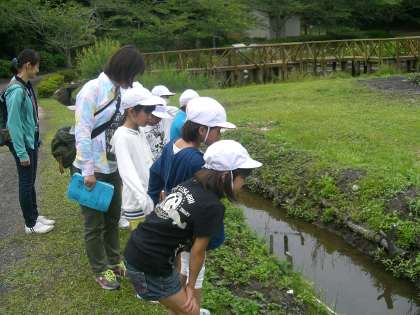 今日の夜、楽しみにしているきもだめしのコースを下見しました。途中の小川では、黒っぽいカニやカメを見つけられました。