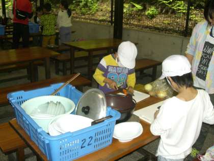 なれない手つきながら、一生懸命カレーを作りました。かまど係も上手に火をつけ、