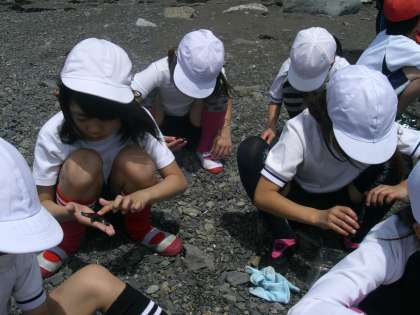 今日の午前中は、宮崎浜での磯観察です。子供たちが大変楽しみにしていたプログラムの一つです。明日行く「志摩マリンランド」の所員の方が、解説に来てくださいました。初めに潮の満ち引きのお話を聞き、続いて、ヒトデを一人一匹ずつもらいました。ヒトデに触るととても硬い感じがします。海の水を入れたプラスチック容器に、ヒトデをひっくり返して入れると、しばらくして、ヒトデがもとに戻る様子が観察できました。子供たちは筋から出てくるヒトデの足に興味津々でした。