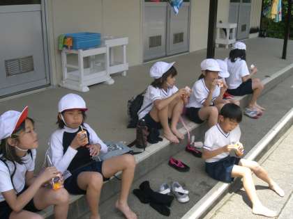 磯観察の最中は大変暑かったので、宮崎浜から帰って子供たちには、ジュースが用意されていました。ちょっとほっこりしている子供たちです。この後は、お昼ご飯に引き続いてつりをします。