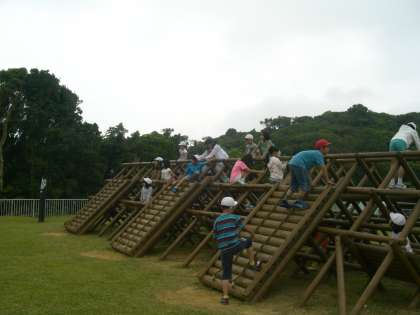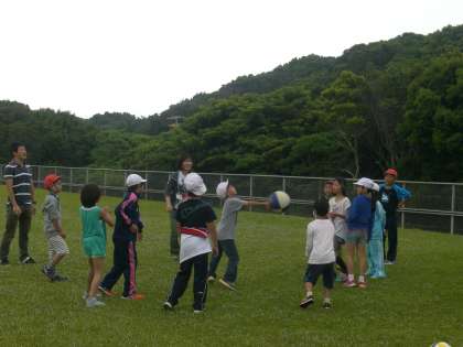 グランドで遊んでいると、紫野小学校のみんなもやってきました。一緒にサッカーをやったり、ソフトバレーボールで遊んだり、退所式の前に楽しい時間を過ごすことができました。