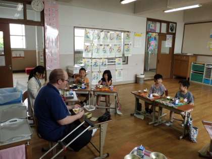 給食も一緒に食べました。お昼休みにはいっしょにじゃんけん列車をして遊びました。