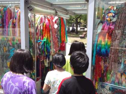 子どもたちは修学旅行の前に広島の事、戦争の事、平和の事と、いろいろ学習してきました。その中で、感じた事を、自分の平和宣言として発表しました。その後、在校生にも協力してもらって作った折り鶴のボードをボックスに納めました。