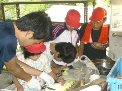 今日の晩御飯は、野外炊事で作るすき焼き風煮です。人参、糸こんにゃく、白菜、ネギ、玉ねぎ、麩などを適当な大きさに切って入れ、水と味付け用のたれを入れて煮込みます。みんな、協力し合いながら手際よく調理していました。楽只小学校の2班は、全部の班の中で一番にできました。