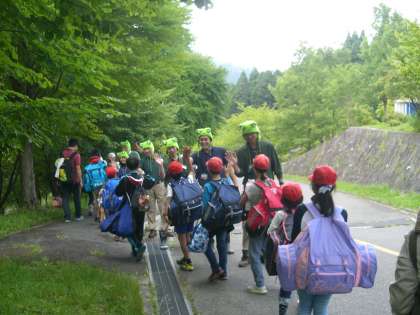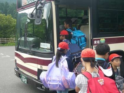 退所式では、所員さんと「はなころ」という名前のカエルが登場し、「のりカエル」(バスに乗って帰る、家に着くまで注意しよう)と「ふりカエル」(四日間を振り返って、おうちの人に話をしよう)について話をしてくれました。最後は、所員さんに見送られて花背山の家を出発しました。