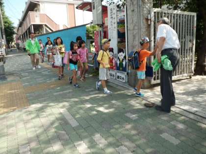 毎月15日を安全,防災の日として,朝の一斉登校指導を行っています。各登校班の担当が集合場所まで行き,学校まで一緒に登校しながら,危険個所や交通ルールの確認をしています。