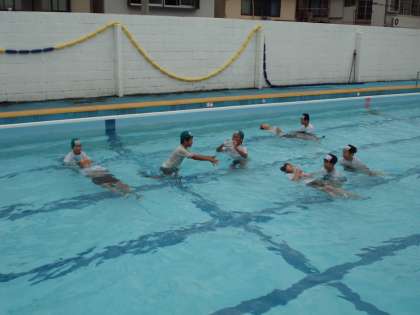 7月21日(火)着衣水泳を行いました。緊急時にどのような行動をしなければいけないかの説明後,実施にペットボトルなど浮力のあるものを使って浮く練習をしました。