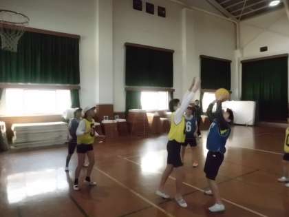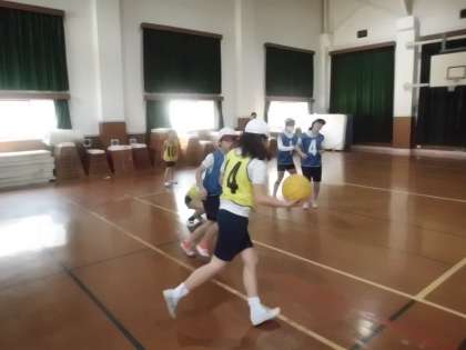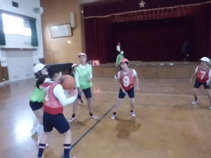 5,6年生の体育は,これまで学習してきた内容を振返り,もう一度やってみたい単元のゲームに取り組んでいます。今回は,一番リクエストの多かった『バスケットボール』を行いました。