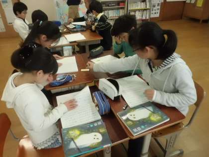 5年生の国語では,1枚の写真から想像を広げて物語作りを行っています。今日はそれぞれが書いた物語をグループで読み合って,構成や表現の仕方について付箋を使って助言し合いました。