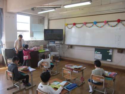 また,2時間目には,国語の学習をしました。『あさ』という詩を読みました。元気いっぱいの声で読めている子もいました。教科書をテレビ画面に映しながら,登場人物の確認もしました。最後には,詩の内容に合わせて,みんなで手をつないで一つの輪を作りました。