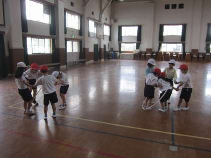 講堂と運動場で体育をしました! 1・2年生