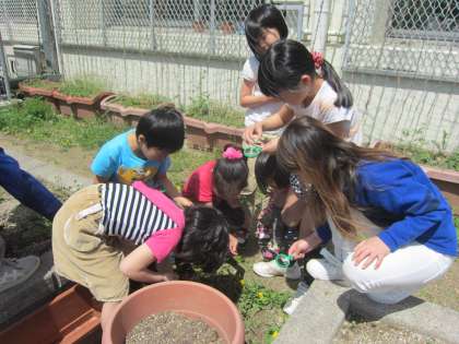 その後,実際に花壇に行って,観察をしました。「ダンゴムシいたー!」「タンポポの綿毛ってこんななってんにゃ。」と,意欲的に観察をしていました。