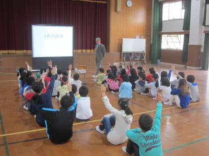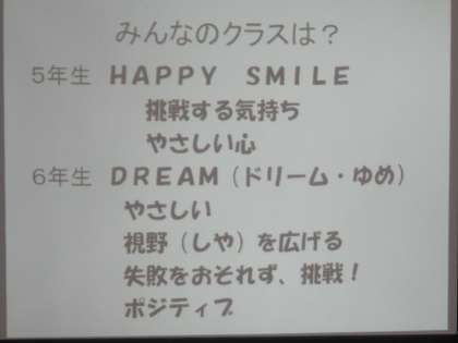 続いて,「こんな子になってほしい!」という,お話がありました。「自分から学ぼうとする子」と「なりたい自分になろうとする子」という,2つの「目指す子ども像」の紹介がありました。子ども達は,たくさん手を挙げながら,話を聞いていました。