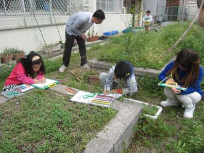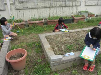 今回は,実際に花壇に行って,自分が1番詳しく調べたい生き物の観察をしました。「テントウムシの口ってどうなってんにゃろ?」「タンポポの葉って,ギザギザしている!」と,虫眼鏡も使いながら熱心に観察をしていました。