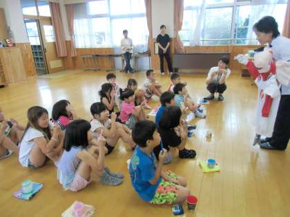 校長先生のお話の後,歯科衛生士の上野 司真子先生から,歯みがきの大切さを学び,大きな人形のデンタ君と一緒に歯みがきをしました。